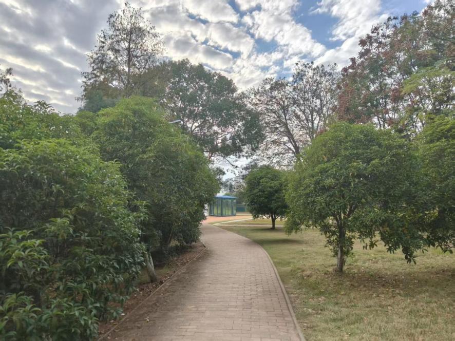 又一天,是多云。有人说,比起晴天,更喜欢多云的日子。过分张扬的阳光会在那时被云朵悄然过滤,温度恰到好处,空气温柔舒适。厚厚的云朵在天空慢慢地游动,摆着它最经典的造型轻轻地来、轻轻地去。如果说晴天的润溪湖似闪着光的镜,那多云天气的湖水便似一匹柔软的绸,宝蓝稳重、湖蓝松快、天蓝轻盈,大自然果然是最从容的调色师。此时沿湖边漫游,心中感到前所未有的平静。这是一个适合向内探索的天气,云也悠扬,风也悠扬,心灵在校园悠扬云层下也悄悄饱满起来。