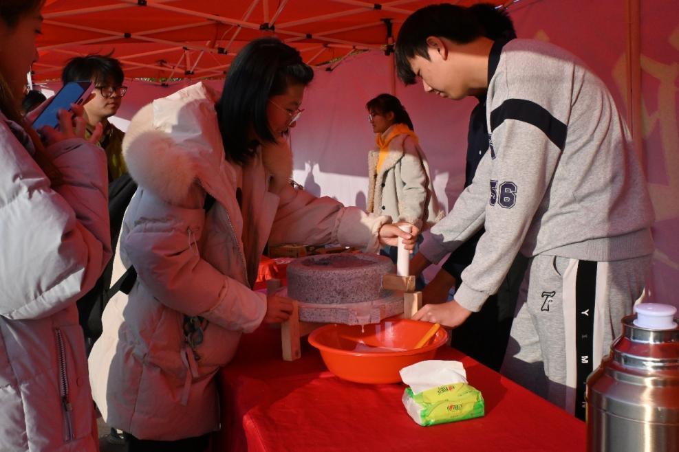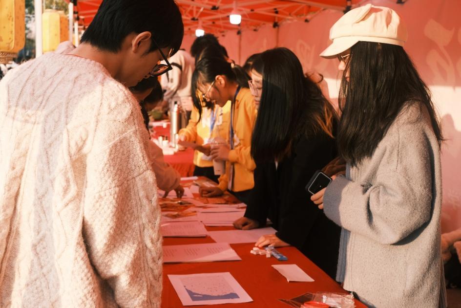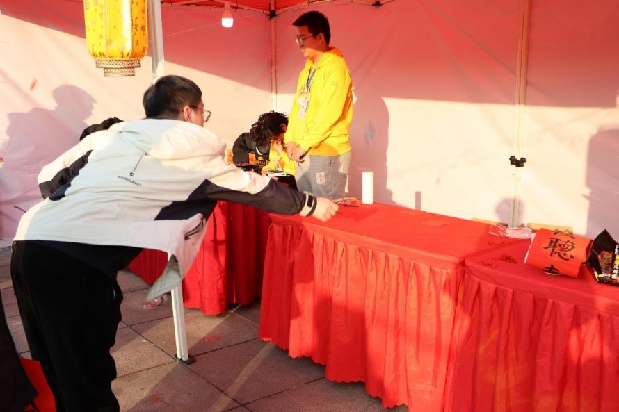 笔墨迎春、豆笺福语、灯谜吟春、投币祈福、好运滚滚、投壶探春、春日粘福、飞花颂春、纸艺怀春活动涵盖书法、绘画、剪纸等多个领域,墨香与欢笑交织,灯影与人影相融,共同酿成一幅流动的、生机盎然的春之画卷。师生同庆,挥毫泼墨,笔锋游走间,春联的横竖撇捺便有了温度,一副副对联蘸满了对新春的祝福与期待。隔几步远,石磨悠悠转动,新磨的豆香与墨香交织成暖融融的甜。投壶摊位前,竹矢似轻羽,奋力一掷,便顺着一道弧线探入壶中,将春意悄然叩响。另一侧,沙包如春燕般穿过铜币方孔,落入岁岁平安的祈愿里。灯谜彩笺垂悬如璎珞,有人蹙眉凝思,有人豁然展颜,欢笑着的讨论声令人心驰神往。纸艺摊前,红纸叠转,剪刀游走,绽出福字、窗花或独属春日的自由想象。而飞花令处,吟诵声清越,字字珠玑,你来我往,织就了一场文字的盛宴。