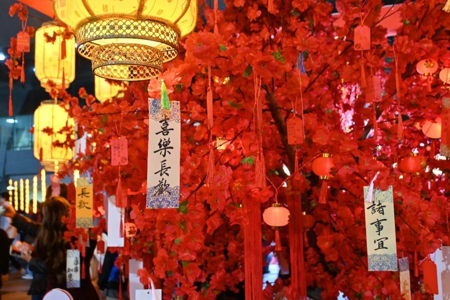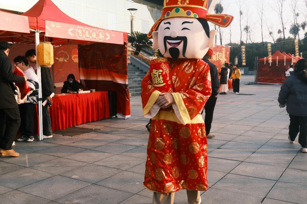 步入游园会,便踏入一片温红的光晕里。会场中央,桃枝斜探,祈愿牌系在花苞旁,随风轻叩,琳琅作响,像在低语青春的心事。一串串灯笼悬于头顶,光晕透过薄纸,柔柔地晕染着往来笑靥。中央空地上的锦色舞狮,正随着欢腾鼓点跃动起伏,引得喝彩阵阵。红底黑字的春联与“福”字点缀在各个角落,墨香仿佛还润着。偶有财神玩偶走过,扬起一片轻快的惊呼。空气里漾着甜暖的气息,年味在此刻变得具体而生动。