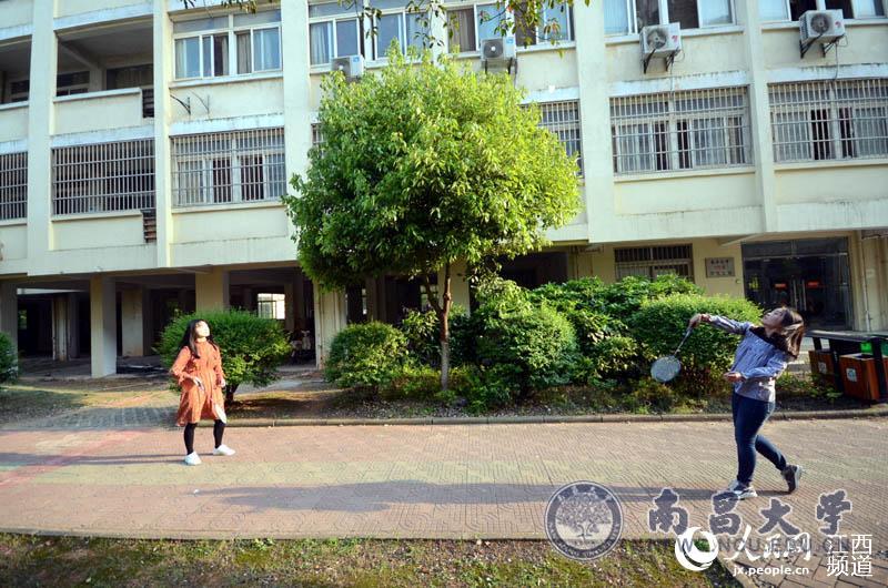 除了学习,她们也爱运动。阳光下,她们抡起球拍打羽毛球