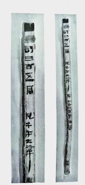 海昏侯墓出土《诗经》简,右为全简,左为局部放大。此简为目录首简,内容是:诗三百五扁(篇)凡千七十六章七千二百七十四言。资料图片