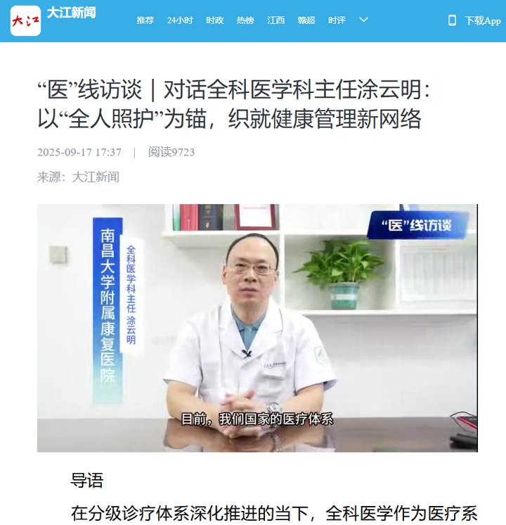 本网讯(大江网)近日,附属康复医院全科医学科主任涂云明以《以“全人照护”为锚,织就健康管理新网络》为题,接受大江新闻独家专访,从多病共存的整合诊疗到慢性病的全程管理,从医患信任的构建到“T型人才”的培养,探寻全科医学的独特价值与实践智慧。现将专访全文予以转载,以飨读者。