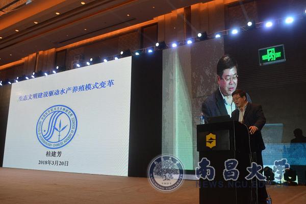 桂建芳主讲的题目是“生态文明建设驱动水产养殖模式变革”