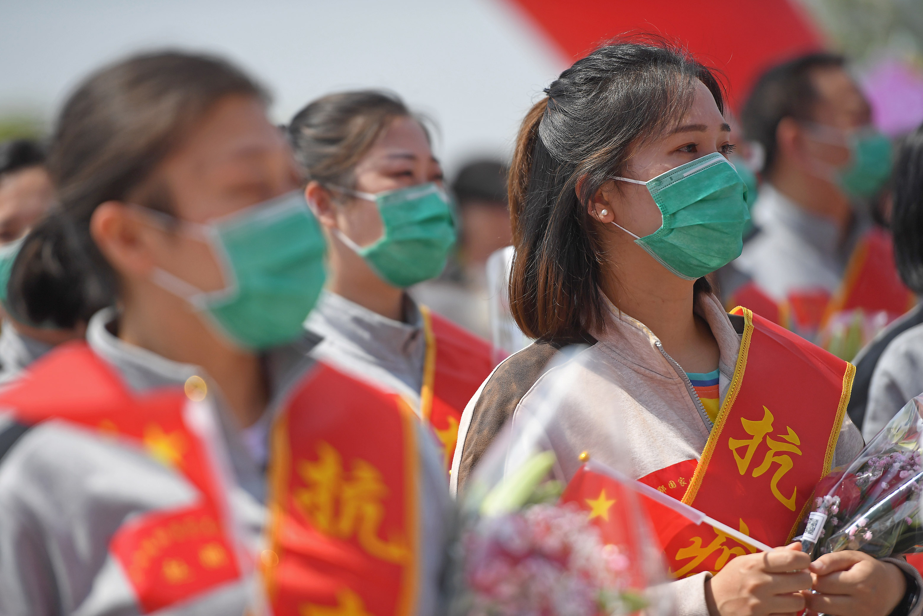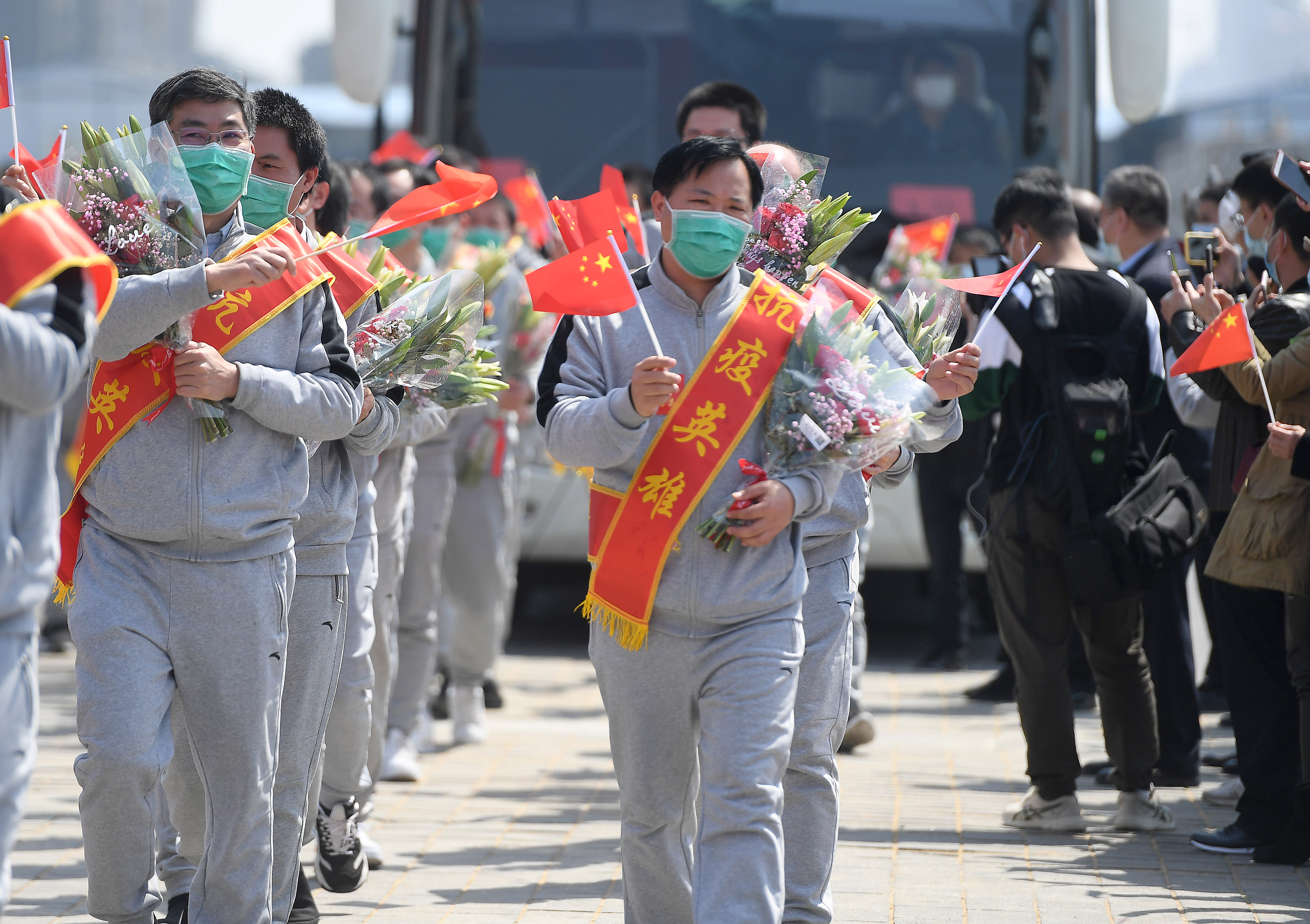 4月15日,在南昌大学一附院象湖院区,医疗队员在欢迎仪式上。