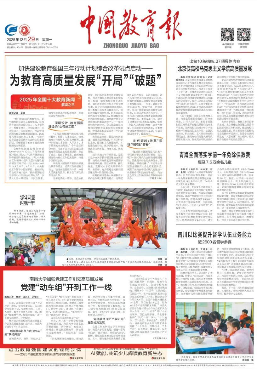 编者按:为深入学习贯彻党的二十届四中全会精神,全面落实习近平总书记关于教育的重要论述以及考察江西、视察南昌大学的重要讲话精神,回顾总结南昌大学“十四五”期间发展成就,科学谋划“十五五”时期发展蓝图,特开设【一路耕耘一路歌】专栏。专栏聚焦学校强化党的建设、深耕思政教育、夯实学科建设、建强人才队伍、推动文化传承、守护医疗健康、服务国家战略、助推地方发展、建设一流大学等方面推出系列报道,展现学校扎根红土地、奋进新时代的生动实践。本期刊发《中国教育报》头版发布的题为《党建“动车组”开到工作一线》的文章,报道我校加强党建工作引领高质量发展的特色做法和成效,内容如下: