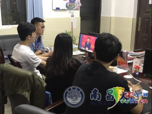 南昌大学研支团共青小学分队成员集体收看学习习近平总书记在北京大学师生座谈会上的讲话。南昌大学研究生支教团 供图