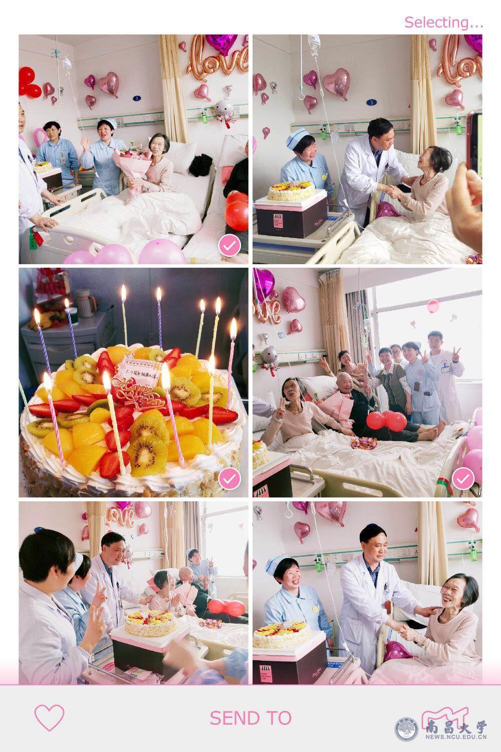 为了完成这个充满爱意的“微心愿”,呼吸科的医务人员精心准备了一份惊喜。在这一天,病房里挂满彩色的气球,布满了鲜花,呼吸科叶小群主任和护士长带领大家推着蛋糕、捧着鲜花走进了病房,与二老的家人一起庆祝老人的钻石婚纪念日。当蜡烛点燃,音乐声响起,医护人员发自内心的祝福声和热烈的掌声交织在一起。李爷爷和老伴共同捧着一束鲜花,一起吹灭庆贺他们相濡以沫60周年的蜡烛时,两位老人脸上写满了欢笑,心里充满了幸福。在场的人们深深感受着二老的爱情:“愿有岁月可回首,且以深情共白头!”