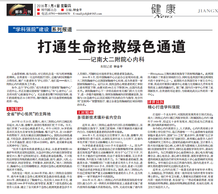 打造好一个龙头学科,对医院的发展具有引领式效应。南大二附院心内科(原江西医学院第二附属医院心内科)建科于1959年,经过五十余年发现来,现已经成为江西省名牌、国内颇具影响的学科。