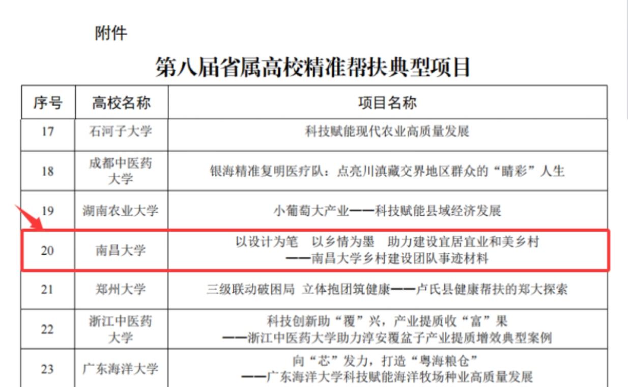 本网讯(党委组织部、建筑与设计学院)近日,教育部公布了第八届省属高校精准帮扶典型项目推选结果。全国各省级教育行政部门及相关高校共推荐多个项目参与评选,经省级教育行政部门和承担定点帮扶任务的直属高校投票推选,我校建筑与设计学院乡村建设团队申报的《以设计为笔 以乡情为墨 助力建设宜居宜业和美乡村》项目成功入选。