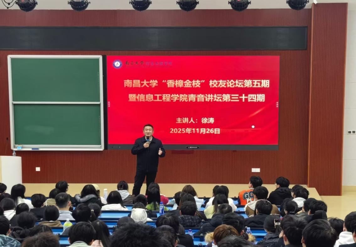 本网讯(招生与就业工作处)11月26日晚,南昌大学300余名在校学生挤满了学校最大的一间阶梯教室,正认真聆听这里举办的一场“破界而行,见职业新天地”校友讲座。讲台上,是回校参加南昌大学“香樟金枝”校友职业讲坛的2001级电子信息工程专业优秀校友徐涛,他正分享着从电子信息工程跨考经济学,再到投身教育事业的职业发展历程。讲座结束后,学生们意犹未尽,如追星般围着主讲嘉宾交流互动。