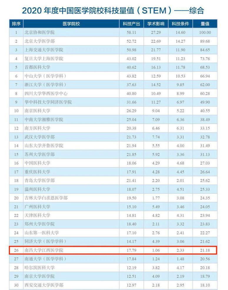 本网讯(医学部)近日,2020年度中国医学院校科技值(STEM)综合排名发布,南昌大学江西医学院已跃居全国医学院校第26位。与2019年度位列第41位相比较,综合排名大踏步前进15位。