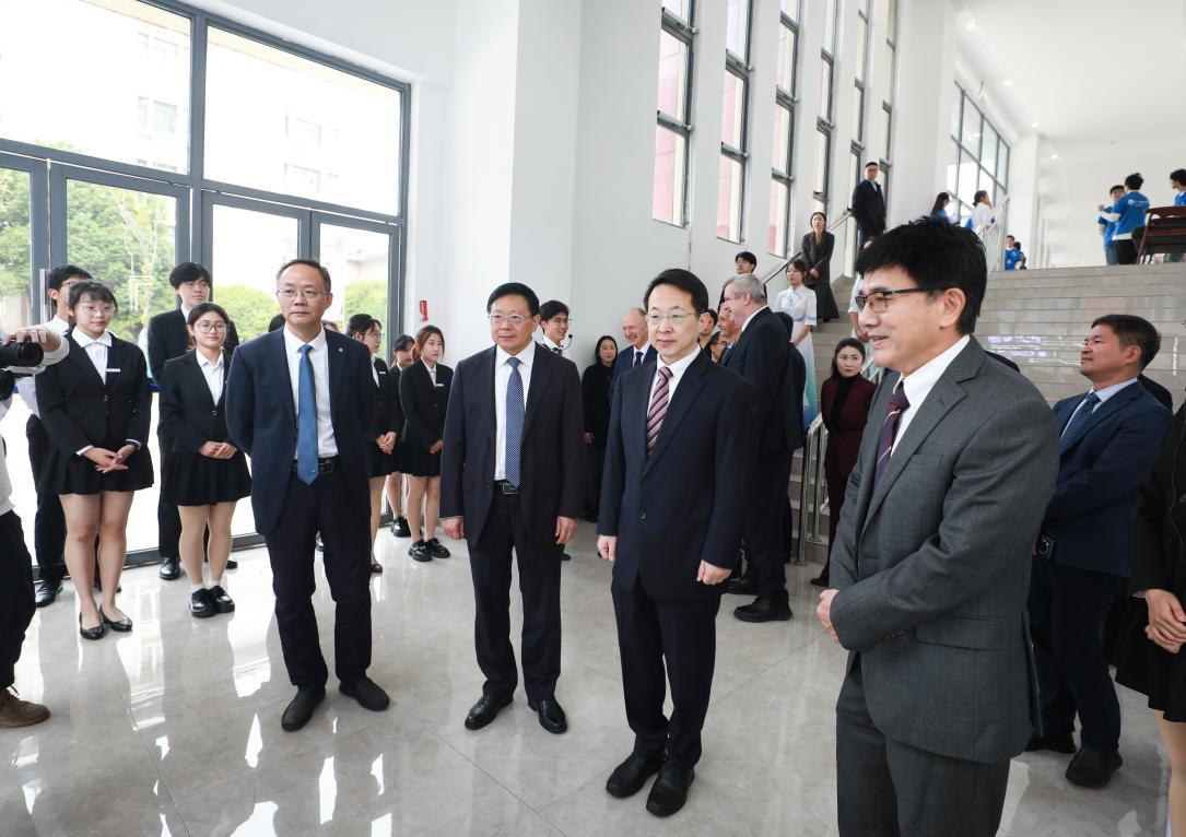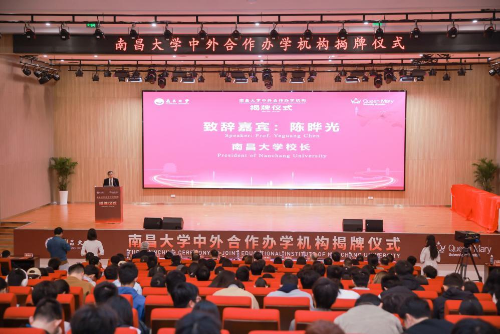 本网讯(记者朱文芳)11月10日,南昌大学中外合作办学机构揭牌仪式举行,江西省教育厅厅长郑磊,南昌大学党委书记罗嗣海,南昌大学校长陈晔光院士,江西省发展和改革委员会副主任李庆红,英国皇家工程院院士、伦敦玛丽女王大学校长Colin Bailey,英国皇家工程院院士、伦敦玛丽女王大学副校长Wen Wang,南昌大学副校长葛刚,宁波诺丁汉大学党委书记沈伟其,英国驻广州总领事馆中国区生命科学及医疗行业副主任Mike McCourt,各省直单位和兄弟高校的领导专家共同到场见证。南昌大学副校长王立、潘秉兴分别主持活动。