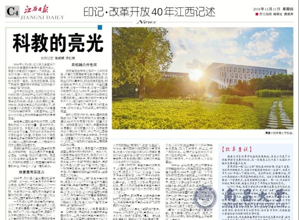 编者按:12月13日,《江西日报》在C4版以“科教的亮光”为题,整版聚焦我校改革开放40年,全文如下: