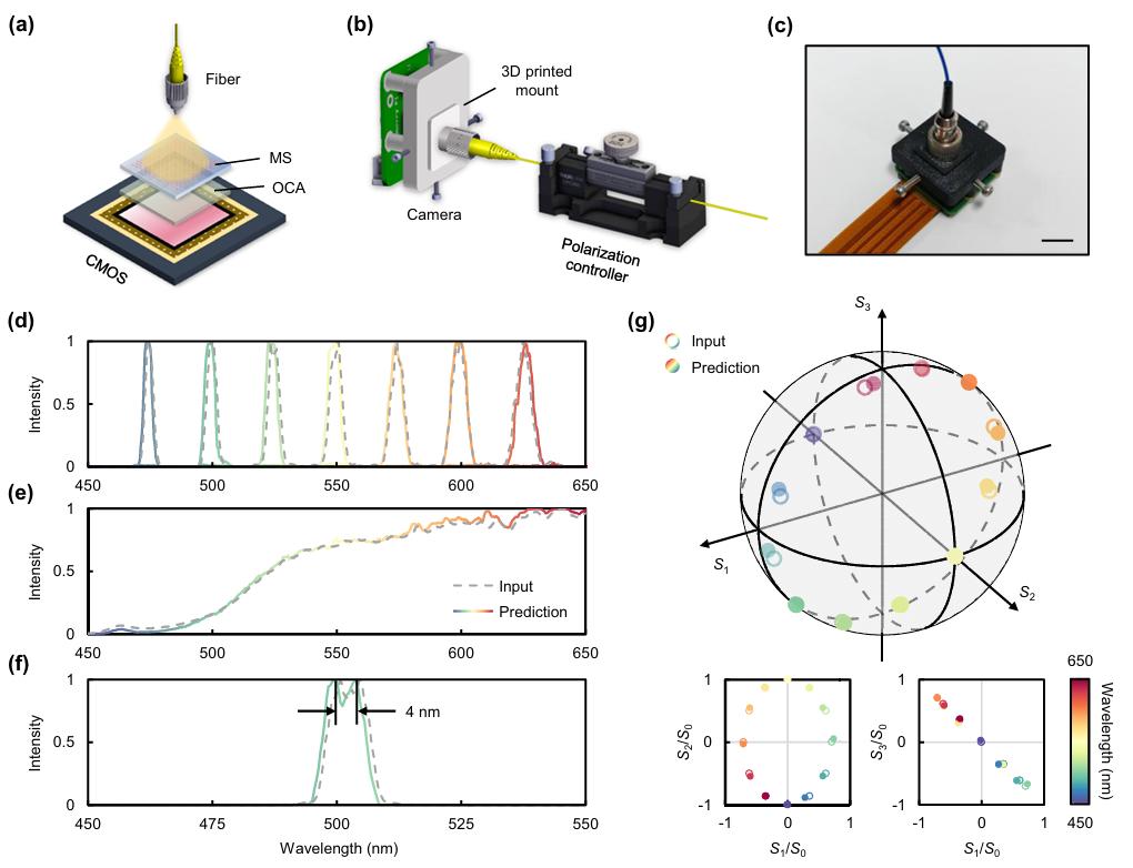该系统通过超构表面对波长与偏振依赖的相位调制,将光信息编码为空间光强分布,再经神经网络解码,单次拍摄即可同时高精度还原光谱与全斯托克斯偏振参数。实验验证,该器件在近红外波段实现宽带高保真探测。为进一步验证其实用性,团队将超表面编码器集成在商用CMOS图像传感器像素阵列上,制作出芯片级集成传感器原型。整个传感器尺寸与普通成像芯片相当,无需任何移动部件或分立光学元件,实现了单次拍摄、多维信息获取。