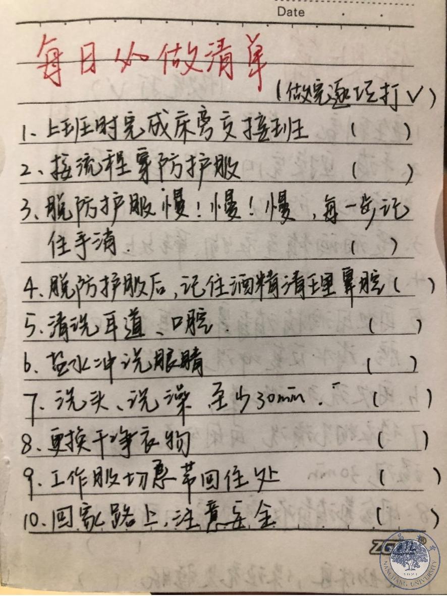 2月7日,我的第一个班次也顺利完成。时间过的非常快,连续两天学习新型冠状病毒性肺炎的疾病知识以及院感培训,仿佛所有的时间用来学习都不够。练习穿脱防护服的每一个细节都关系到自己是否防护到位、是否有被传染的风险。晚上组长通知我明天上班,我一遍遍操作练习,躺在床上已经是凌晨3点了。一点都不紧张是骗人的,即便来之前做好充分的心理准备,真正上岗前,脑子里就不停想明天面对200多位确诊患者,自己能做什么,能帮什么……