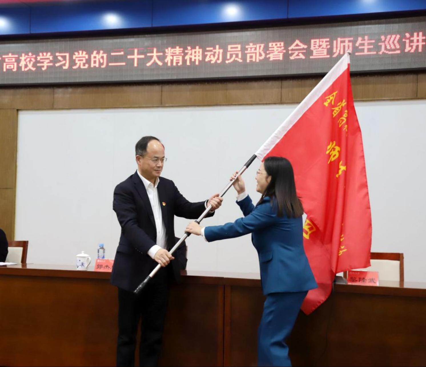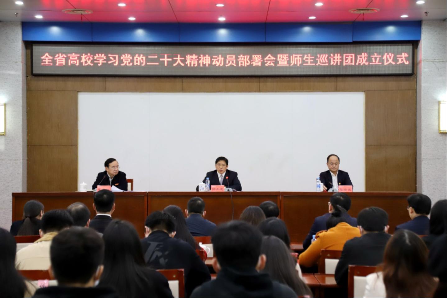 郭杰忠首先代表省委教育工委、省教育厅对全省高校学习宣传党的二十大精神师生巡讲团的成立表示热烈地祝贺。他指出,学习好、宣传好、贯彻好党的二十大精神,是全省教育系统的首要政治任务。组织全省高校师生巡讲团集中宣讲党的二十大精神,是学习宣传贯彻党的二十大精神的重要举措。