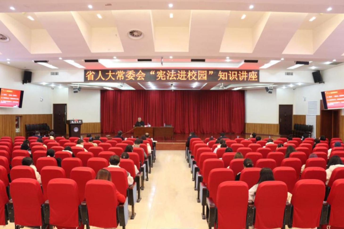 本网讯(法学院)今年12月4日是第九个国家宪法日,也是我国现行宪法公布实施四十周年。围绕“学习宣传贯彻党的二十大精神,推动全面贯彻实施宪法”的国家宪法宣传周活动主题,省人大常委会“宪法进校园”知识讲座于12月2日下午在我校文法楼举办。省人大法制委副主任委员叶敏健,我校副校长葛刚,省人大常委会法工委副主任刘永亮、杨润华出席讲座。