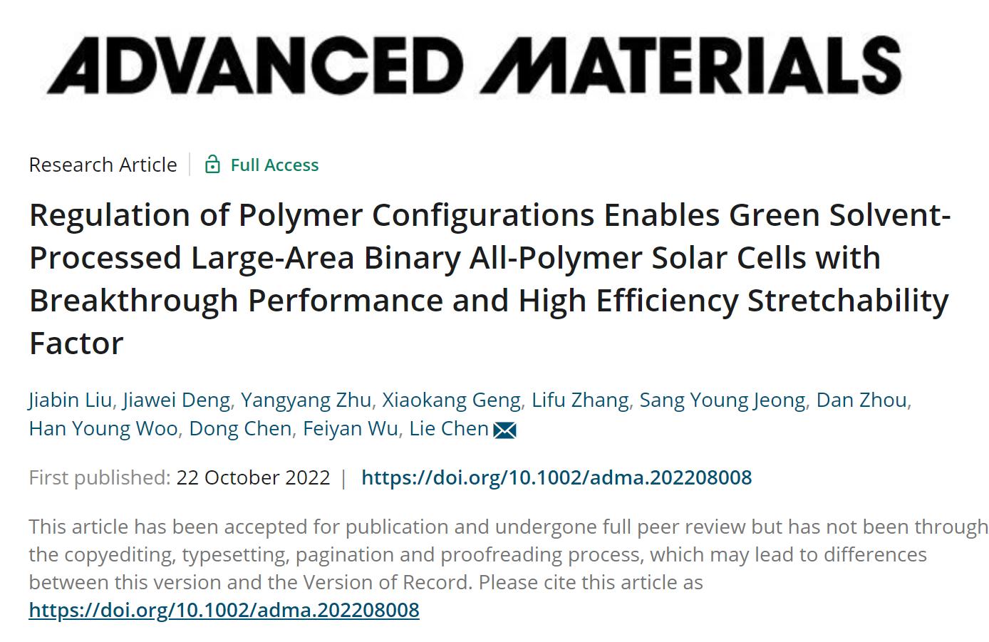本网讯(化学化工学院)近日,我校谌烈教授团队在聚合物太阳能电池领域取得了重要研究进展,团队利用绿色溶剂加工的大面积全聚合物太阳能电池性能获得巨大提升。其研究工作不仅为柔性可穿戴太阳能电池提供了一类具有突破性能的新型材料,而且还阐明了评估有机太阳能电池综合性能的概念。
