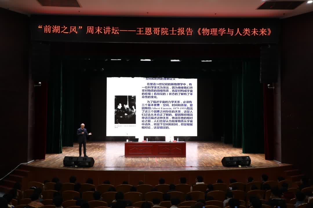 在前湖校区音乐厅,王恩哥以《物理学与人类未来》为题,介绍了物理学的发展历程以及物理学对人类社会科技发展的创新推动作用,并举例阐述了物理学是科技发展的基石,人类科技文明每时每刻都离不开物理学的伟大贡献等观点。在互动环节,王恩哥对同学们提出的问题做出了耐心细致的解答,生动幽默的语言引来阵阵掌声,现场学术气氛浓烈。
