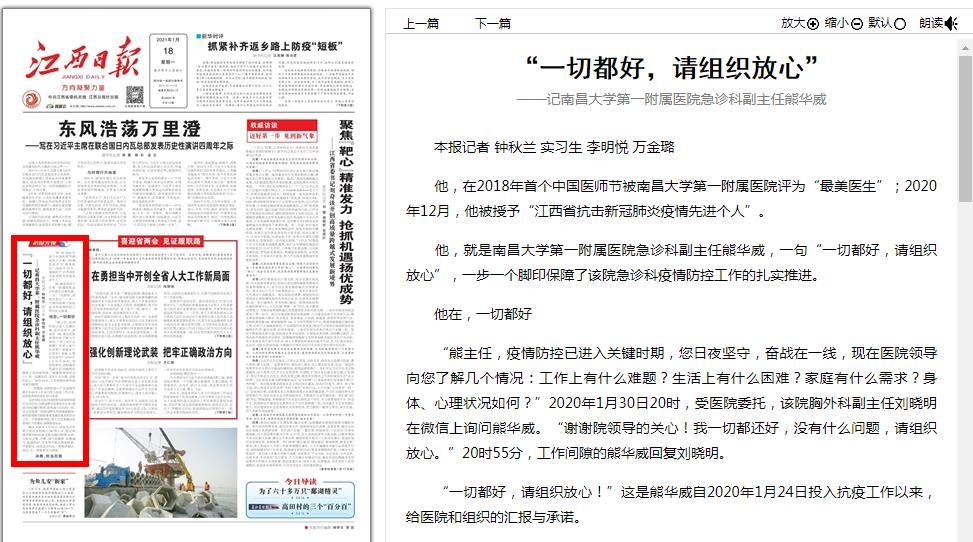 编者按:1月18日,江西日报头版以《一切都好,请组织放心》为题报道我校第一附属医院急诊科副主任熊华威抗疫先进事迹。全文如下:
