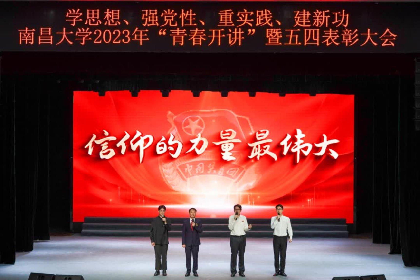这是南昌大学2023年“青春开讲”暨五四表彰大会的现场。为深入开展学习贯彻习近平新时代中国特色社会主义思想主题教育,牢牢把握主题教育“学思想、强党性、重实践、建新功”的总要求,充分发挥先进典型模范带头作用,团结引领广大团员青年踔厉奋发、砥砺笃行,学校举行了南昌大学2023年“青春开讲”暨五四表彰大会,校党委书记罗嗣海、正厅级领导徐求真,校党委常委徐光兵、饶勇,团省委领导与学校相关职能部门负责人、师生代表500余人参加活动。