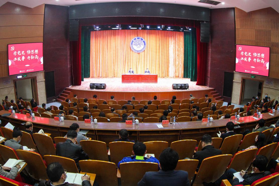 全体在家校领导,各二级党组织书记、副书记,各单位主要负责人,离退休老同志、师生代表300余人参加学习。