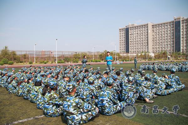 休息期间,新生们席地而坐,学长小教员主动上台交流,与同学们互动交流,歌声、笑声、掌声不时地回荡在军训场。