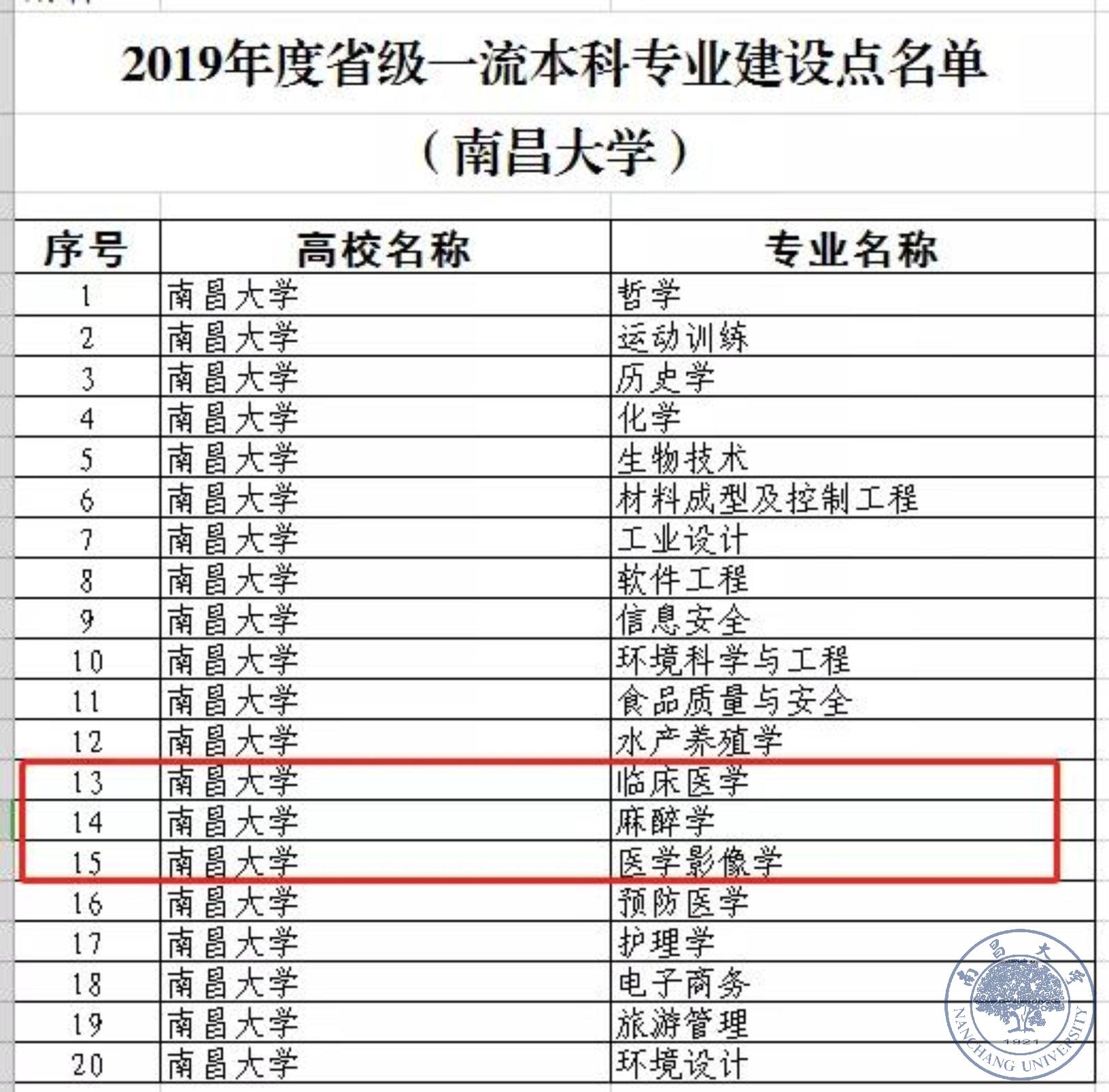 近日,教育部办公厅公布2019年度一流本科专业建设点名单,南大一附院临床医学、麻醉学、医学影像学入列省级一流。名单显示,南昌大学进入国家和省一流的本科专业分别为20个,药学专业进入国家一流,预防医学、护理学携手南大一附院3个专业进入省一流。