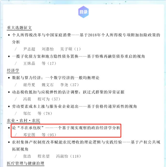 本网讯(经济管理学院)近日,南昌大学经济管理学院邓宏图教授(第一作者)、徐宝亮博士(通讯作者),广州大学经济与统计学院博士研究生段昱兵、赵燕博士和中国社会科学院农村发展研究所马太超博士合作的论文《“论不在承包权”——一个基于现实观察的政治经济学分析》在国内顶级期刊《管理世界》2026年第3期正式发表。
