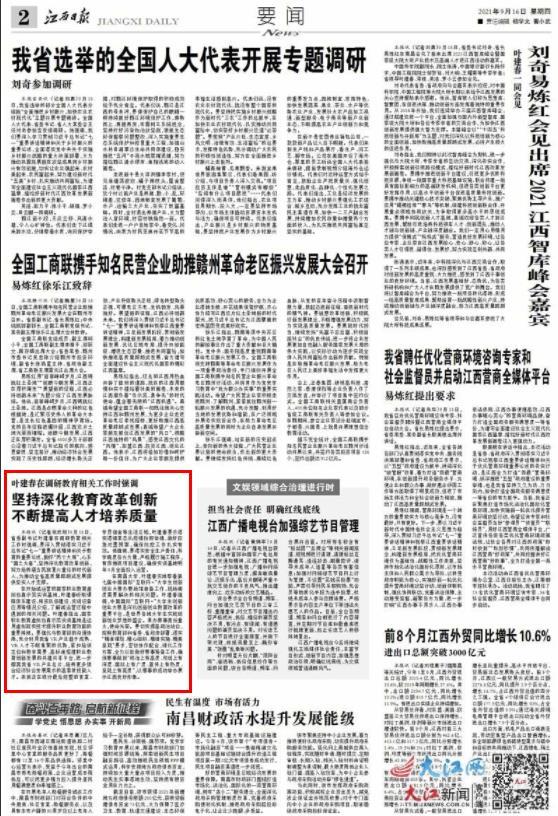 编者按:9月15日上午,省委副书记叶建春来校调研第七届中国国际“互联网+”大学生创新创业大赛筹备工作,《江西日报》以《坚持深化教育改革创新 不断提高人才培养质量》为题刊发报道。相关内容如下: