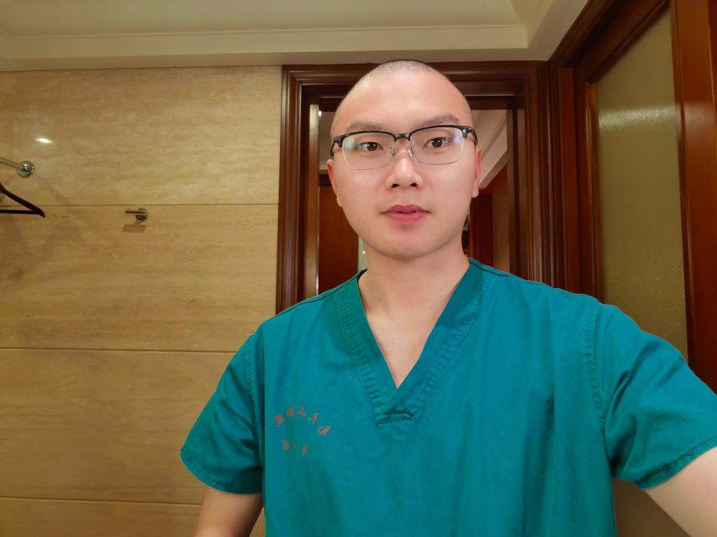 为方便穿脱防护服,朱克豪在上海驻地酒店将头发剃光。(受访者供图)