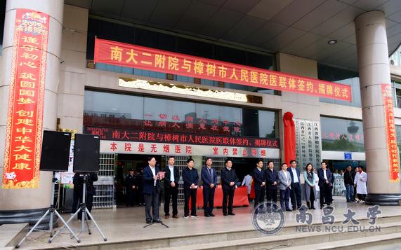 本网讯(第二附属医院)4月12日,南昌大学第二附属医院与樟树市人民医院“医联体”签约、揭牌暨大型义诊活动在樟树市人民医院举行。校党委书记喻晓社与樟树市市长董晓明共同为“医联体医院”揭牌。