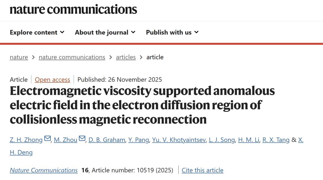 本网讯(空间科学与技术研究院)近日,我校教育部“空间信息智能感知技术”工程研究中心的空间物理与深空探测交叉研究团队,联合瑞典空间物理研究所学者,在近地空间环境能量快速释放研究中取得重要突破。相关成果以Electromagnetic viscosity supported anomalous electric field in the electron diffusion region of collisionless magnetic reconnection为题,于2025年11月26日在线发表于国际顶级期刊《自然・通讯》(Nature Communications),为解决空间等离子体中磁场重联能量耗散机制问题迈出了关键一步。空间科学与技术研究院钟志宏特聘研究员为第一作者,物理与材料学院周猛教授为通讯作者,南昌大学为第一单位和唯一通讯作者单位。