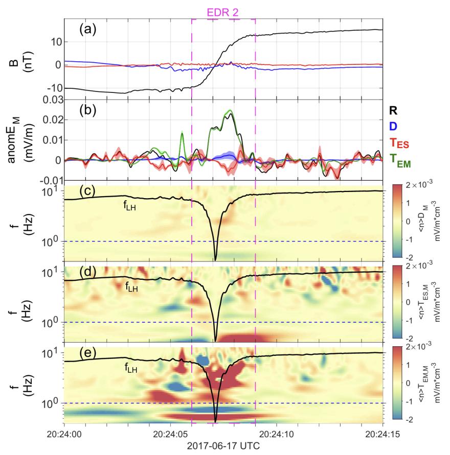 卫星在磁场重联电子扩散区观测到由电磁湍动导致的反常效应。(a)磁场,(b)磁重联面外方向总反常电场及各项贡献,(c)反常拖曳力的谱图,(d)静电反常粘滞力的谱图,(e)电磁反常粘滞力的谱图。如图所示电磁反常粘滞力占主导。
