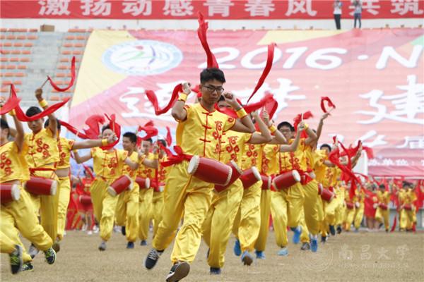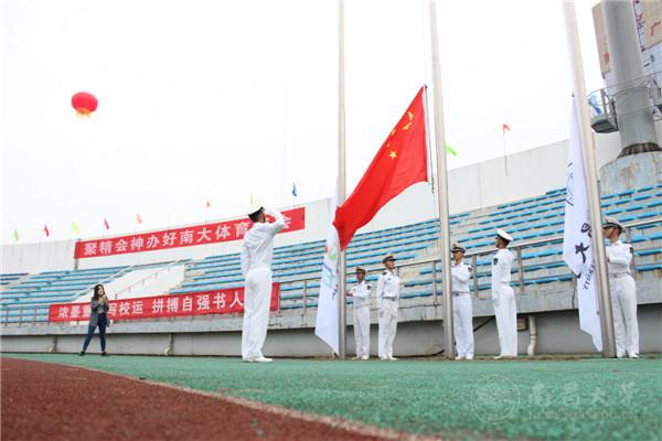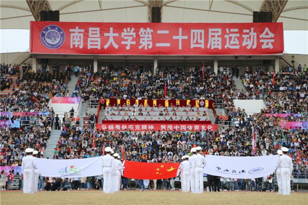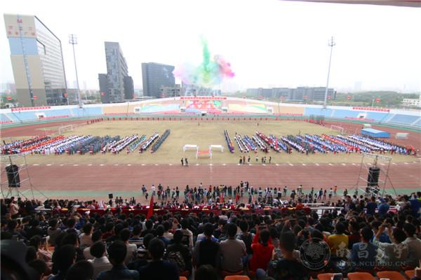伴随着激亢高昂的乐曲和鼓点声,一身雪白戎装的国防生仪仗队庄重地托举着国旗、校旗、运动会会旗入场。由来自33个学院的近2000余名学生组成的方阵队伍迈着整齐的步伐,以饱满的姿态依次走过主席台。分别以“爱学校”、“爱科学”和“爱学院”为主题的三辆花车紧随其后,上面摆放着的南昌大学建筑模型,以学校标志性科研成果硅衬底LED作为材料,充分展示了学校近年来在科学研究方面取得的辉煌成就。