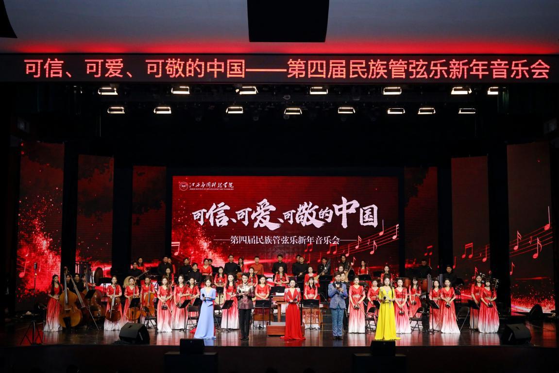 为丰富活动形式,以文化艺术架起两校师生情感沟通的桥梁,2025年12月30日,两校联合举办的“可信、可爱、可敬的中国”第四届民族管弦乐音乐会在江西应用科技学院音乐厅精彩上演,各族学生代表,部分留学生、外籍教师、归国留学人员等1400余人现场观看演出。音乐会节目由辰林乐团编排,两校师生联袂出演。既有展现中华优秀传统文化的琵琶协奏《草原小姐妹》,也有洋溢着民族风情的唢呐独奏《喜丰收》;既有歌颂伟大祖国的原创曲目《我的祖国》,也有充满青春力量的乐曲《青春思念》。舞台上,两校师生默契配合、神采飞扬,舞台下,掌声雷动、其乐融融。整场音乐会以乐传情、以美育人,在悠扬的旋律与优美的歌声中,展现中华文化的独特魅力,传递各民族手足相亲、守望相助的深厚情谊,让铸牢中华民族共同体意识的种子在师生心中生根发芽。