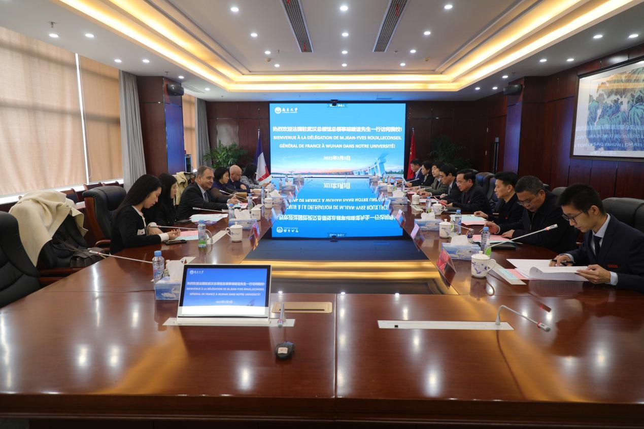 本网讯(记者曾慧 学生记者邓安琪)3月3日,法国驻武汉总领事胡建谊一行来访我校。江西省外事办公室副主任李雨强、校党委书记喻晓社会见来访嘉宾。副校长邓晓华主持座谈会。