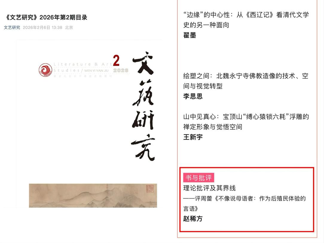 本网讯(人文学院)近日,人文学院中文系赵稀方教授撰写的学术论文《理论批评及其界线——评周蕾〈不像说母语者:作为后殖民体验的言语〉》在权威学术期刊《文艺研究》2026年第2期“书与批评”栏目正式发表。
