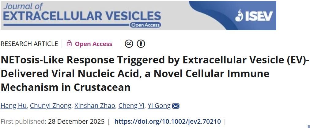 本网讯(生命科学学院 刘正东)近日,我校生命科学学院龚燚教授课题组在甲壳类免疫方面取得重要进展,相关成果以“NETosis-Like Response Triggered by Extracellular Vesicle (EV)-Delivered Viral Nucleic Acid, a Novel Cellular Immune Mechanism in Crustacean”为题发表在Journal of Extracellular Vesicles上(国际细胞外囊泡学会ISEV会刊,IF=14.5),这是该期刊发表的首篇水产动物研究论文,南昌大学为唯一完成单位。