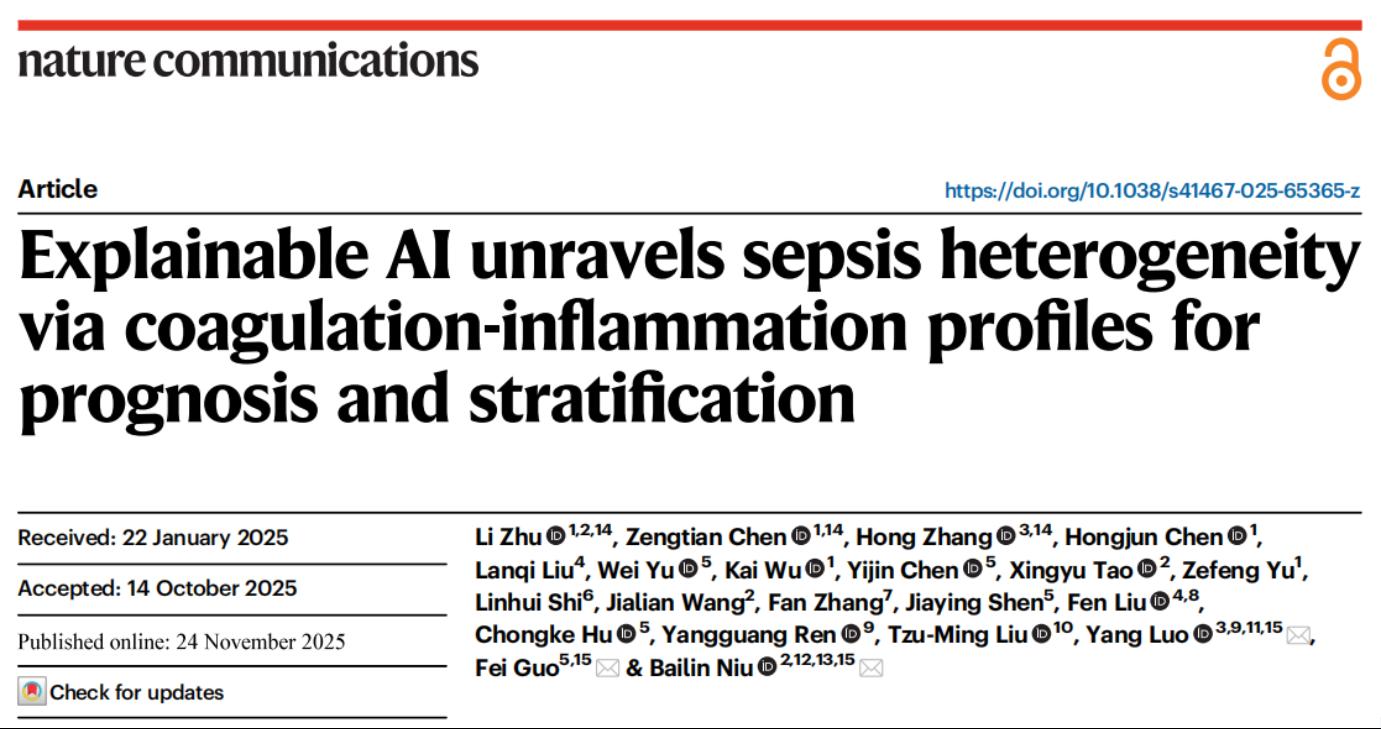 本网讯(信息工程学院)近日,我校信息工程学院朱莉副教授团队联合重庆大学、宁波大学等单位,在AI+脓毒症诊疗领域取得重要进展。研究成果以“Explainable AI unravelssepsis heterogeneity via coagulation-inflammation profiles for prognosis and stratification”为题,发表于国际期刊Nature Communications。南昌大学为第一署名单位。