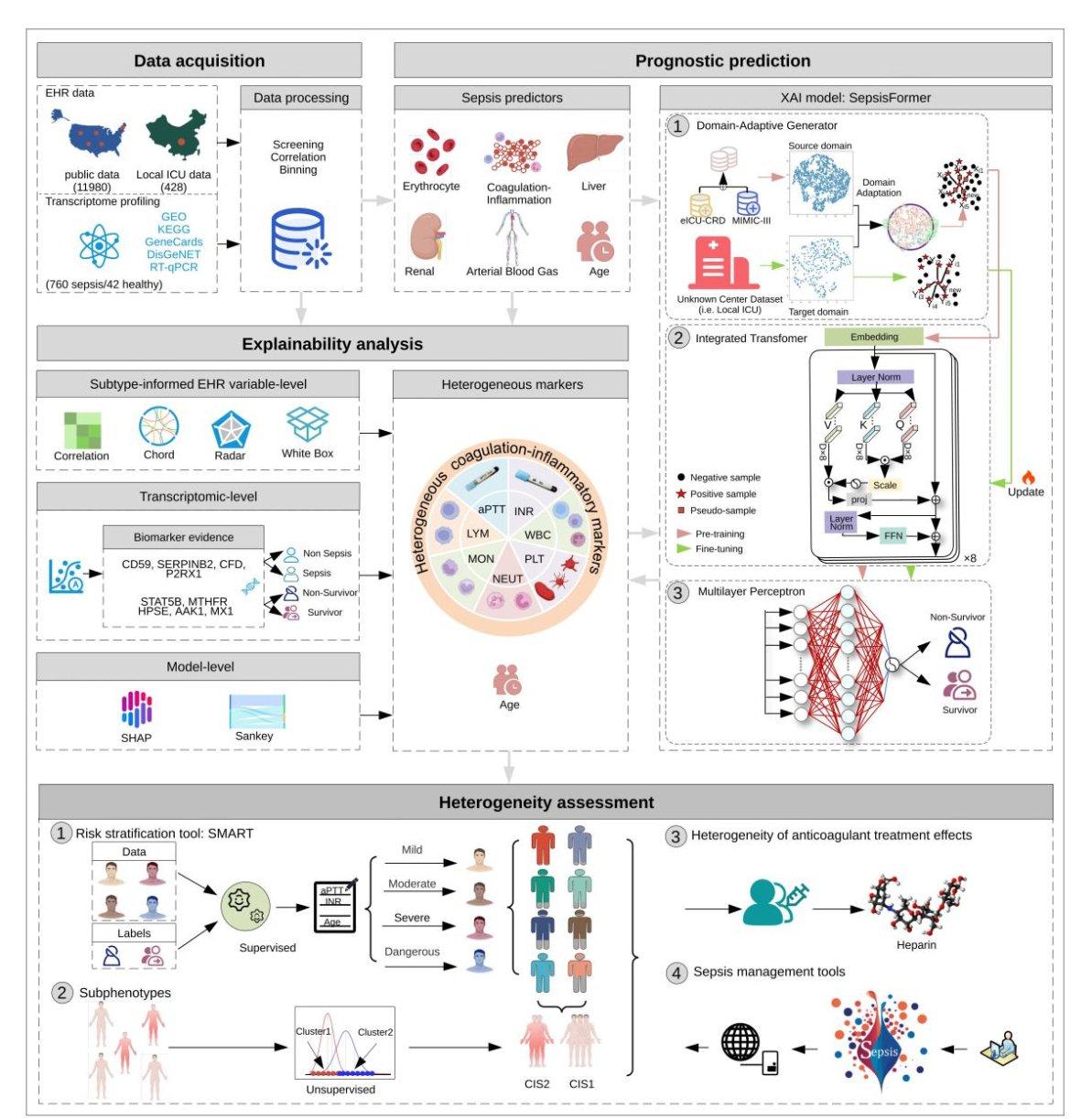 脓毒症,作为全球性的重大健康威胁,每年影响着数千万患者,是导致医院内死亡的主要原因。其高度复杂的异质性,是改善患者预后的关键瓶颈。面对这一挑战,研究团队创新性地融合了可解释人工智能(XAI)与多组学,解码了脓毒症复杂异质性背后的凝血-炎症核心机制图谱。这项研究基于一个涵盖亚洲、欧洲、北美共计12,408名患者的大规模、多中心回顾性队列,构建了一套集预后预测深度学习模型(SepsisFormer)、自动风险分层工具(SMART)、生物学机制解析与个性化治疗于一体的综合方法。