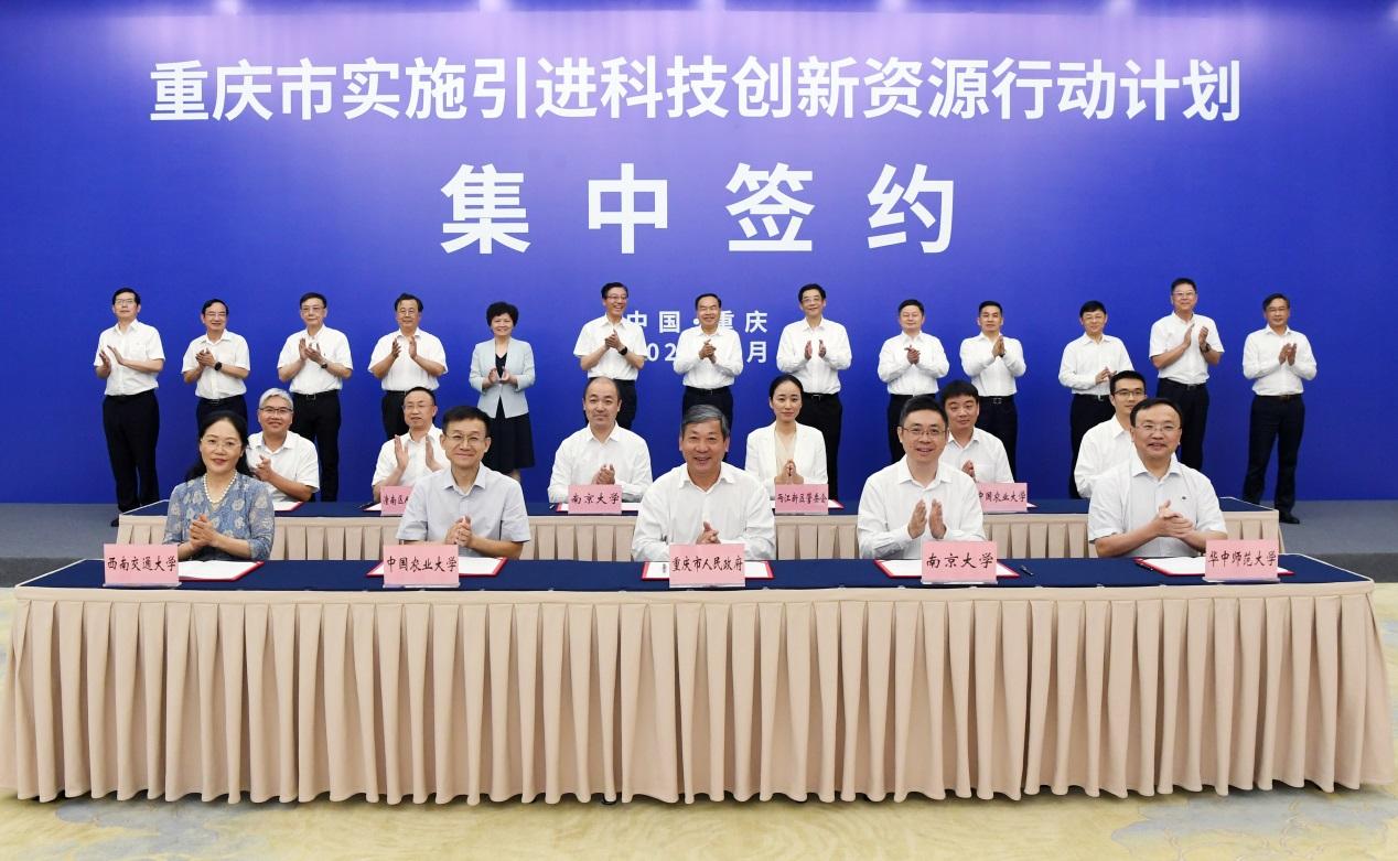 在重庆市引进科技创新资源集中签约仪式上,我校副校长刘成梅及中国农业大学、南京大学、华中师范大学、西南交通大学相关领导分别代表各自高校与重庆市政府签订合作协议。