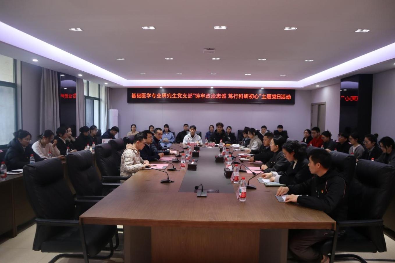 本网讯(基础医学院)12月30日上午,基础医学专业研究生党支部开展“铸牢政治忠诚·笃行科研初心”主题党日活动,围绕2025年党员基本培训第三次集中大课学习内容进行研讨。校党委常委、组织部部长刘建光,省教育工委组织部跟岗学习干部宋维毅,基础医学院相关负责人等30余名党员共同参会研讨。
