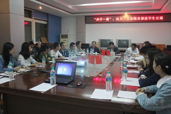 据悉,自2014年10月开始,为推进“连心、强基、模范”三大工程、加强服务型党组织建设,机关三支部与外国语学院学生党总支开展了“支部(班级)共建”活动。今年4月,“两学一做”学习教育开展以来,机关三支部的全体党员先后与翻译专业141班的22名同学结对子、树帮扶、共成长、同进步,推动“两学一做”学习教育扎实有效开展。此次微党课进学生公寓活动,就是“支部(班级)共建”众多活动中的一次创新尝试。
