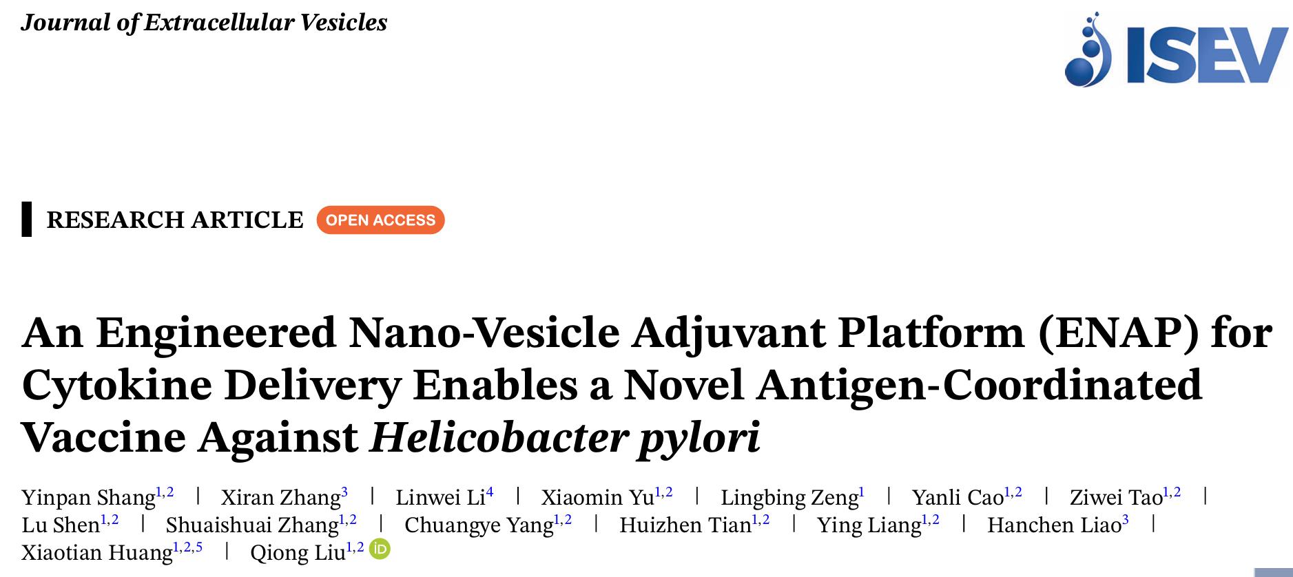 本网讯(基础医学院)近日,我校基础医学院刘琼教授、黄孝天教授团队在疫苗佐剂研发方面取得重要进展,相关成果以“An engineered nano-vesicle adjuvant platform (ENAP) for cytokine delivery enables a novel antigen coordinated vaccine against Helicobacter pylori”为题发表在国际权威期刊Journal of Extracellular Vesicles上(国际细胞外囊泡学会ISEV会刊,IF=14.5)。该工作由南昌大学独立完成。