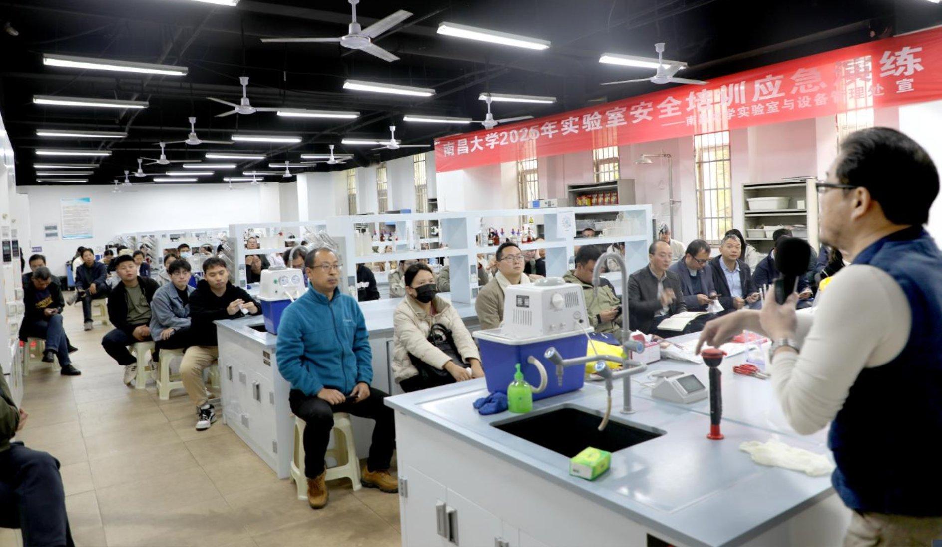 本网讯(实验室与设备管理处)11月11日上午,实验室与设备管理处联合化学化工学院举办“南昌大学2025年实验室安全培训暨突发事件应急演练”活动,进一步筑牢实验室安全防线,切实提升师生安全风险防范意识与突发事件应急处置能力。来自全校各单位的百余名师生代表参加现场培训,通过“理论讲解+实操演练”组合模式,系统学习掌握实验室安全知识与应急处置技能。副校长葛刚出席活动并讲话。