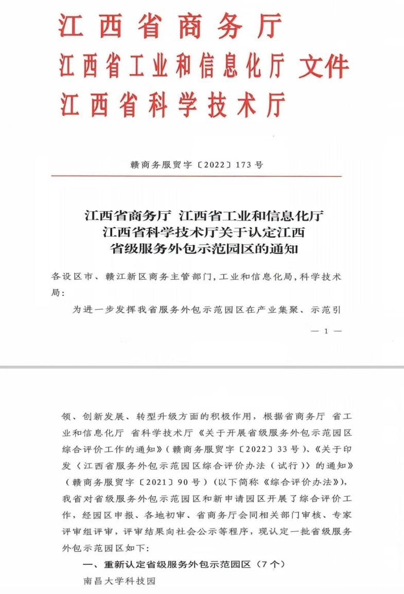 本网讯(技术转移中心 欧阳润)近日,江西省商务厅、工业和信息化厅、科学技术厅发文,南昌大学科技园再次获评“省级服务外包示范园区”,为省内唯一获此殊荣的大学科技园。