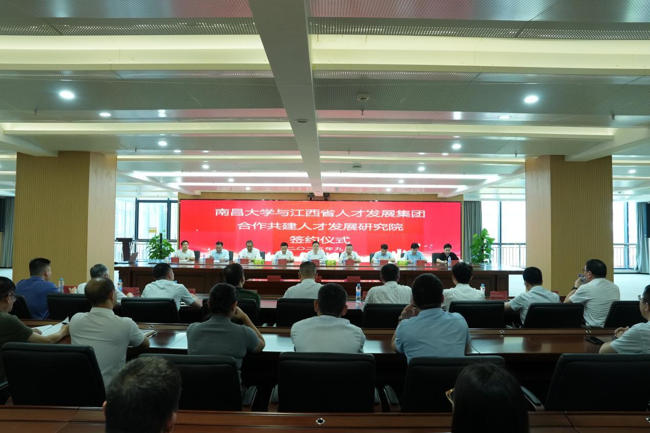 本网讯(人才发展与信息研究院)9月26日下午,南昌大学与江西省人才发展集团合作共建人才发展研究院签约仪式举行。省委组织部部务委员、省委人才办主任王玉皞,南昌大学副校长吴丹,省人才发展集团党委书记、董事长彭元,集团党委副书记、总经理熊上东出席仪式。