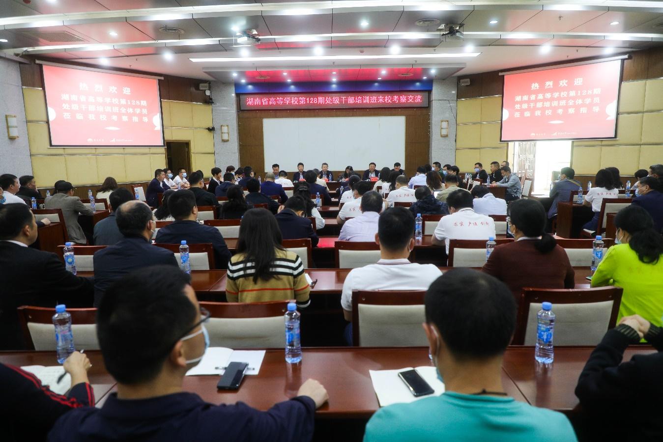 本网讯(党委组织部)4月28日上午,湖南省委教育工委党校常务副校长刘国华带领湖南省高等学校第128期处级干部培训班来校考察交流。校党委副书记李德平会见考察团一行。