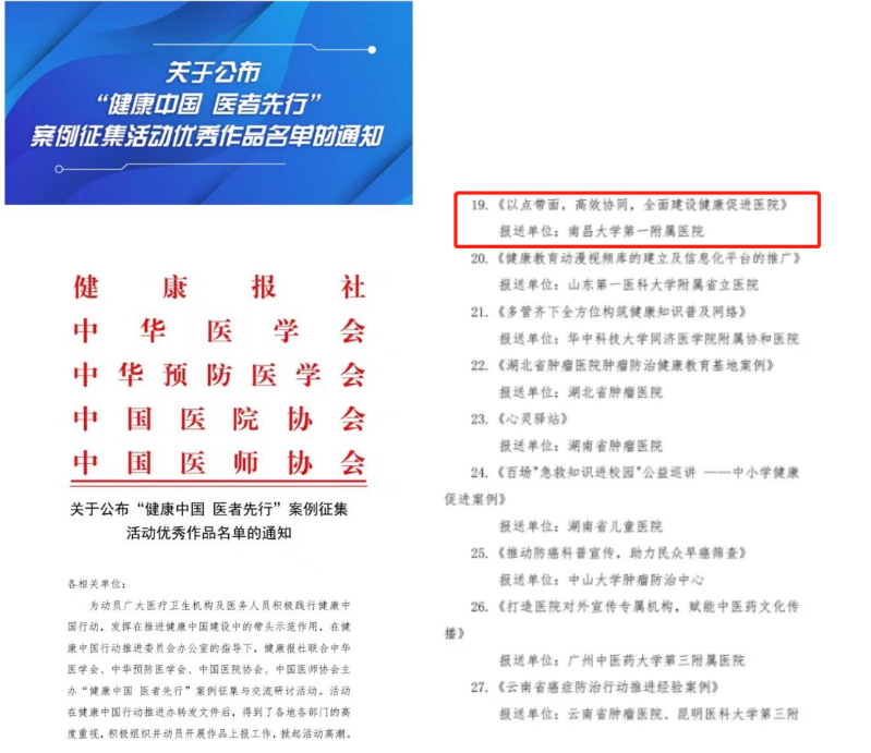 本网讯(第一附属医院)近日,由健康报社联合中华医学会、中华预防医学会、中国医院协会、中国医师协会主办的“健康中国 医者先行”案例征集活动公布优秀作品名单。南大一附院报送作品《以点带面,高效协同,全面建设健康促进医院》从全国1977件作品中脱颖而出,荣获“最具影响力案例”。